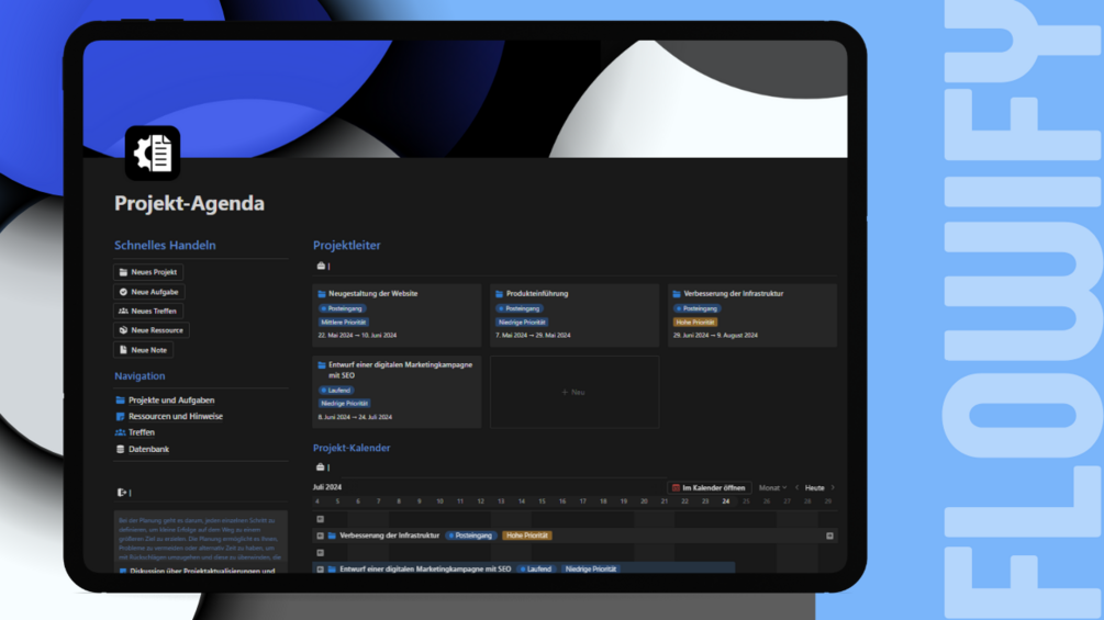 Transformieren Sie Ihre Planung mit unserer Notion-Projektplanungsvorlage! Dieses Tool wurde entwickelt, um die Verwaltung von Projekten, Aufgaben, Ressourcen, Meetings und Notizen zu zentralisieren und zu rationalisieren. Es ist unverzichtbar, um Ihre Arbeit zu organisieren und Ihre Ziele effizient zu erreichen.